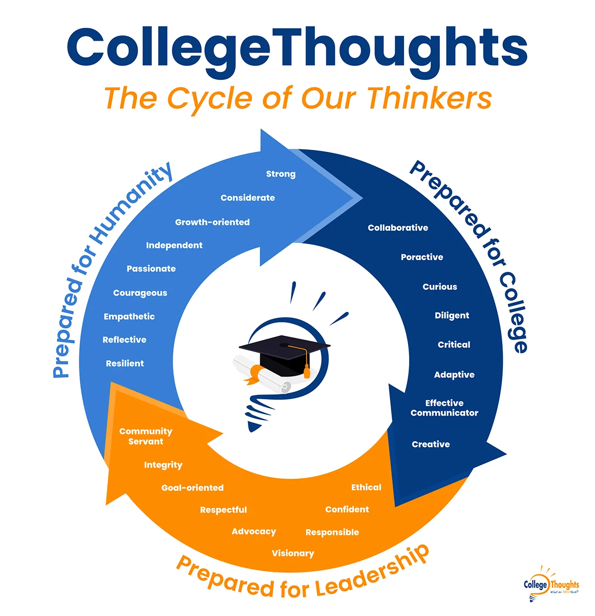 While many college advising services are transactional, limiting their work to test preparation or essay writing, we realize that college is just one step towards a journey into young adulthood. We want our CollegeThinkers to be well prepared for college, but we also want them to be stronger leaders and better people as they prepare to make a positive impact on our world. We created the Cycle of our Thinkers so that you can see the characteristics that we hope our students will develop during our time together.